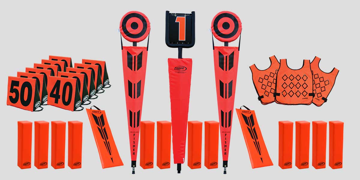 - Includes: Flip Indicator, 7' Chain Set, 11 Sideline Markers, 3 Orange Vests, 3 sets of 4 Deluxe Pylons, and 2 Target Markers