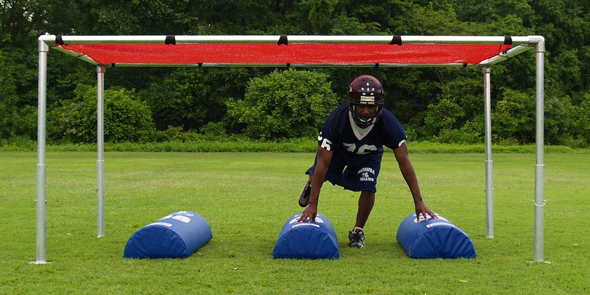 Aluminum construction with sturdy aluminum castings on all 4 corners. Telescoping legs for 10" of adjustability from 44" to 60" (without wheels). Work all directions in a good athletic football position. All sizes come with a blue vinyl mesh top.