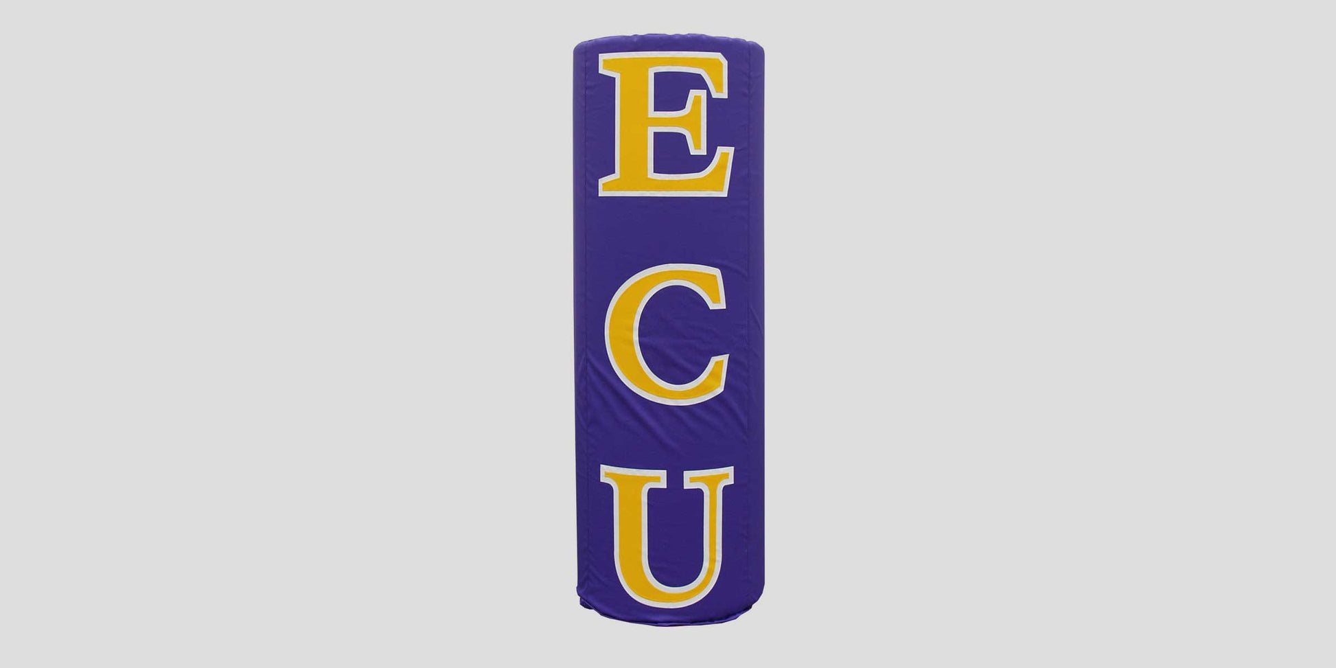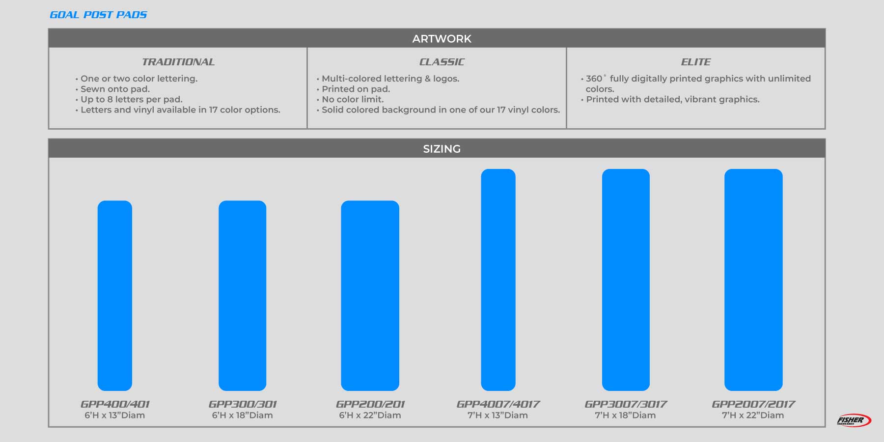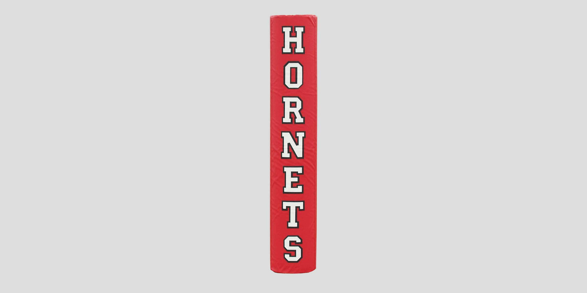Two color lettering, sewn onto the pad. Up to 8 letters per pad. Letters and vinyl available in 17 color options. These come in two closure styles. The Varsity series is a wrap style cover with top and bottom protection that increases durability The PRO series is a fully encased vinyl cover which keeps the foam dry and in perfect shape guaranteeing maximum lifespan. Both styles have a velcro flap in the back for closure. All of our goal post pads meet NCAA and NFHS safety standards. Heavy-duty, 18 ounce coated vinyl nylon covers. Solid polyfoam cylinder with a center cutout to match your goal (please provide pole diameter or circumference when ordering). For custom logos you will want to choose the Elite or Classic style pads. School logos or promotionals are all available from Fisher.
